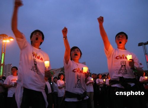 5月20日,當(dāng)日全國哀悼日進(jìn)入第二天,沈陽市民高呼“汶川加油,四川雄起,中國加油”等口號哀悼四川汶川地震遇難同胞。