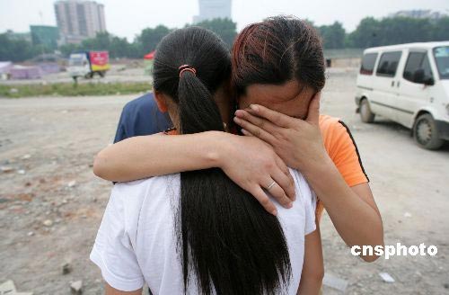 5月20日中午12時20分,在北川中學學生臨時安置點,李春榕找到了尋找了六天的姐姐的女兒——北川中學初一六班的楊曉丹,在得知父母已不在人世時,楊曉丹與小姨相擁而泣。中新社發(fā) 劉震 攝