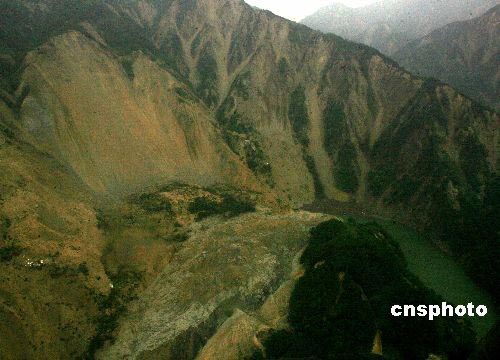 五月十二日汶川大地震使一座大山崩塌,泥石堵塞河道形成危險的堰塞湖。如果潰堤將淹沒北川全縣和綿陽災區,后果不堪設想。中新社發 賈國榮 攝