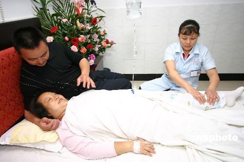 5月21日,護士給汶川來的產婦陳梅談心。17日上午10時許,重慶市永川區婦幼保健院順利地把來自四川省汶川地震災區的陳梅產婦生下一男嬰,那是她經過10小時,徒步32公里,從汶川震區撤離出來,才換來的小生命。嬰兒從出生以來,醫院讓小生命住進嬰兒培養箱,以促進小生命的身體健康。中新社發 陳仕川 攝