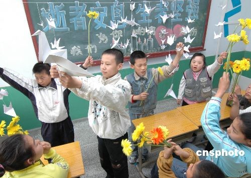 5月21日是全國哀悼日最后一天,遼寧省錦州市古塔區培智學校的300名智障小學生用雙手疊制了1000只紙鶴,還買來黃菊花悼念地震逝去的小朋友,放飛心愿,為災區人民祈福。中新社發 李鐵成jz 攝