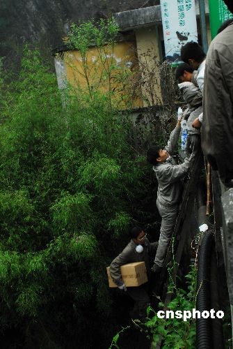 5月12日四川發(fā)生大地震后,臥龍保護(hù)區(qū)管理局的職工于第一時(shí)間將大熊貓轉(zhuǎn)移到安全地帶。臥龍保護(hù)區(qū)工作人員是這樣給熊貓運(yùn)送食物。中新社發(fā) 臥龍人 攝