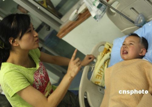 5月21日,在四川汶川5·12大地震中被救出后向解放軍“行隊禮”的北川3歲男孩郎錚在綿陽市解放軍某醫院成功完成斷臂續接手術,精神面貌很好。圖為郎錚與媽媽吳曉紅進行語言交流。中新社發 趙振清 攝
