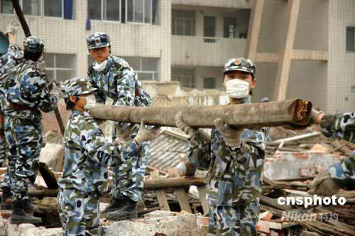 圖:中國(guó)女海軍陸戰(zhàn)隊(duì)員四川災(zāi)區(qū)清理廢墟