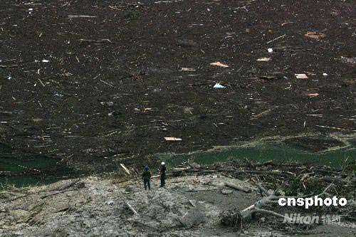 汶川大地震發生以后,水利地質人員乘直升飛機降落到北川唐家山堰塞湖,檢測水位上漲和污染危情,嚴密監測由于一座大山的崩塌堵塞河道形成的堰塞湖。中新社發 賈國榮 攝