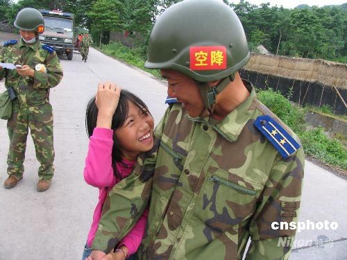 5月21日,中國空降兵某團官兵在洛水鎮(zhèn)下院村幫助村民恢復生產。失去雙親的12歲女孩李佳見到解放軍就像親人一樣依戀。中新社發(fā) 劉烊宏 攝