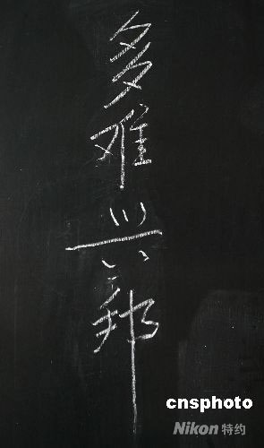 溫家寶總理5月23日在看望臨時安置在四川綿陽長虹培訓中心北川中學高三同學時,用粉筆在黑板上寫下的“多難興邦”四個大字。中新社發 蒲滔 攝