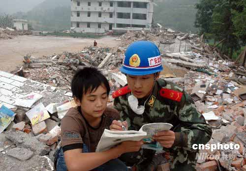 圖:四川武警廢墟上輔導災區(qū)孩子功課