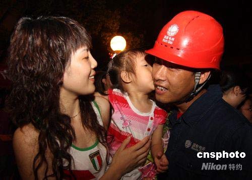5月25日晚,湖南婁底市電業局赴四川重災區綿竹市和什邡市抗震救災一線的第一批20名搶修勇士,在圓滿完成抗震救災保電任務后,勝利返回湖南婁底市。中新社發 郭國權 攝