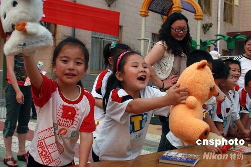 5月28日上午,河南油田五一社區黃山幼兒園開展“油城飄起黃絲帶,師幼愛心獻災區”義賣捐款活動。200多名小朋友把自己平時喜愛的玩具、課外書等拿出來義賣,在園內擺起一個個“愛心”小攤。幼兒園將義賣款項做為孩子們“六一”兒童節的愛心禮物,捐獻給四川災區的小朋友。中新社發 李永哲 攝