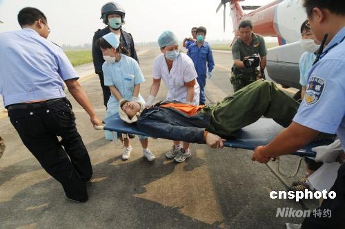 干溝電站地勢(shì)險(xiǎn)峻,四周高山環(huán)繞,由于塌方嚴(yán)重,亂石堆砌,惡劣的環(huán)境給救助直升機(jī)實(shí)施救助帶來(lái)極大的困難。直升機(jī)離最近的懸崖不到5米。機(jī)長(zhǎng)李嘉只能將直升機(jī)從200米高空緩緩地一點(diǎn)點(diǎn)往下降,最后穩(wěn)穩(wěn)地懸停在30米高空。B-7125救助直升機(jī)立即進(jìn)入救助模式,絞車手迅速拉開(kāi)機(jī)艙,救生員緊握著鋼纜,躍出艙門(mén),從30米的空中降下。此時(shí),被困16天的4名被困人員從山溝里爬到救援點(diǎn),救生員李春林迅速用救援套將一位傷員套好,然后頂著直升機(jī)旋翼產(chǎn)生的大風(fēng),抓緊鋼纜,又空中搖晃了十幾圈,終于把第一位傷員救上直升機(jī)。緊接著,另一位救生員楊建輝也降落在地面上,他用救援套將兩名傷員一起救上直升機(jī)。隨后,楊建輝再次躍出機(jī)艙,迅速來(lái)到重傷員尚征林身邊。楊建輝用盡全身力氣把他套好,然后緊抱著他,抓緊鋼纜,一起被拉上直升機(jī)。經(jīng)過(guò)10多分鐘的緊急救援,4名傷員都成功救上直升機(jī)。