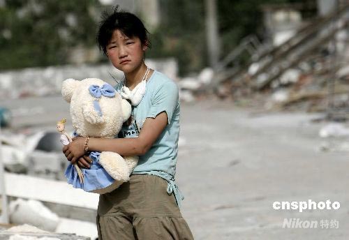 5月28日,四川平武縣南壩鎮(zhèn)的一名受災女孩在廢墟中尋找到了自己心愛的玩具熊。平武縣在5. 12地震中損失慘重,25個鄉(xiāng)鎮(zhèn)18.6萬人全部受災90%以上房屋全部倒塌。中新社發(fā) 杜洋 攝