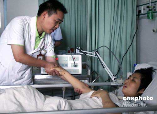 6月2日,廣西醫科大學第一附屬醫院康復技師龍耀斌在給傷員郭昌碧做術后康復訓練。據了解,該醫院對第一期55例四川地震傷員實施手術已全部完成,目前治療的重點開始向康復轉移,主要包括心理康復和肌體功能的康復,已有心理醫生和理療師開始介入到康復治療當中。中新社發 林艷華 攝