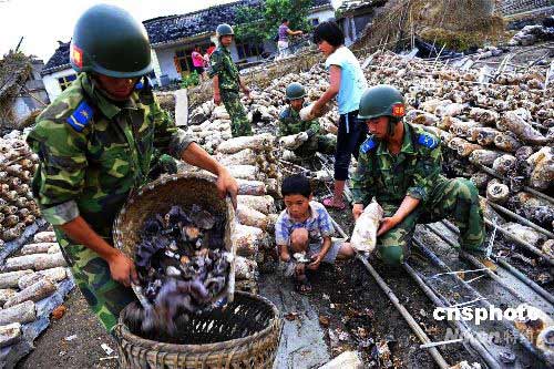 六月三日,空降兵士兵在四川什邡幫助百姓搶收木耳。四川什邡是重要的木耳生產基地,地震中損失慘重。五月十二日發生地震后八小時即空降至該地的空降兵部隊,目前正開展幫助民眾重建家園工作,兩天內他們已幫助農民搶收木耳九千多公斤,以盡力減少地震帶來的經濟損失。中新社發 慎重 攝