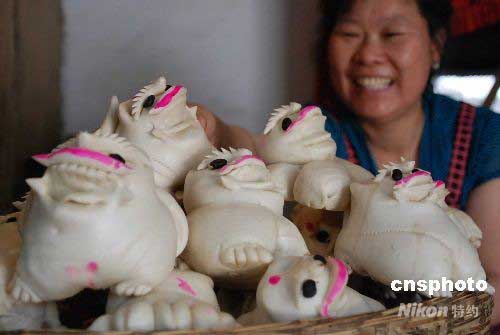 2008年6月7日,居民在趕蒸老虎饃喜迎端午佳節(jié)。過(guò)端午蒸老虎饃,敬奉懷念祖先,祈禱“平安、吉祥、和諧”是山西晉南運(yùn)城一帶群眾敬奉古代詩(shī)人屈原和祖先流傳的傳統(tǒng)民間習(xí)俗和傳統(tǒng)面食藝術(shù)。中新社發(fā) 高新生 攝