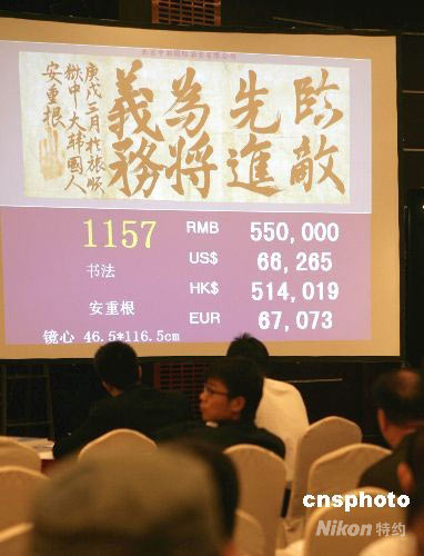 6月21日,中拍國際2008大型藝術品拍賣會在北京亞洲大酒店正式開拍,當天有609件書畫作品參加拍賣。其中一幅紙質黃舊的書法作品——“臨敵先進,為將義務”吸引眾人的眼球,是當年刺殺伊藤博文的韓國民族英雄安重根在獄中的絕筆書,當場以55萬元人民幣的高價競拍成功。中新社發 趙雋 攝