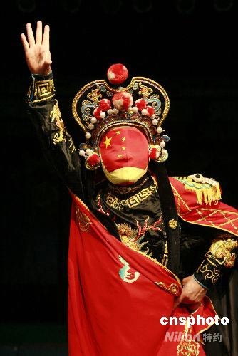 四川遂寧市川劇團變臉大師劉世虎在舞臺上表演川劇絕活——變臉,奧運福娃、奧運徽標、中國國旗在他臉上一一展示。中新社發 鐘 敏 攝