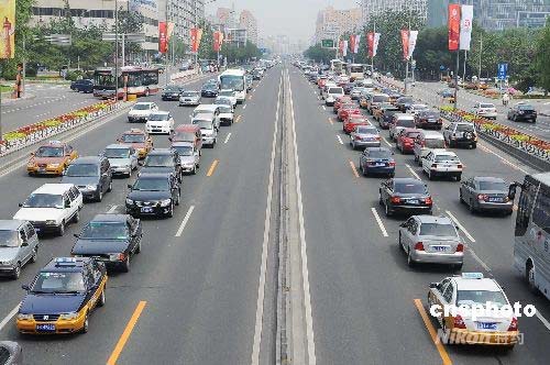 從7月20日起,北京全面實施奧運交通管制,所有車輛將按照單雙號行駛,“禁飛令”、“錯時上下班”等奧運保障措施等也同時實施。隨著8月8日北京奧運會開幕腳步越來越近,北京正式進入“奧運時間”。圖為用黃白線劃分的奧運專用車道內側車道從當日起啟用。中新社發 陳文 攝