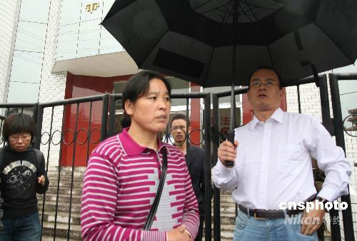 九月二十七日,“華南虎照”造假者周正龍因詐騙罪和非法持有彈藥罪在陜西旬陽(yáng)縣人民法院公開(kāi)開(kāi)庭審理,沒(méi)有獲準(zhǔn)入內(nèi)旁聽(tīng)庭審的周妻羅大翠(中)在法庭外等候消息。中新社發(fā) 程成 攝