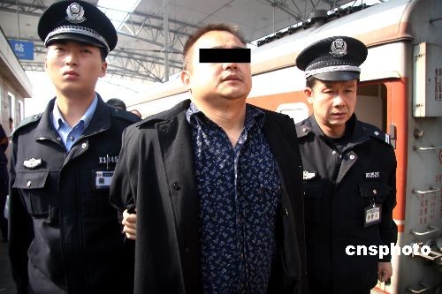 2008年10月13日,沈陽鐵路公安處乘警支隊在成都開往沈陽的北的K388列車上抓獲一名潛逃十年的殺人犯,犯罪嫌疑人池繼云是四川金堂縣人,1973年生人,1998年12月13日,他在四川省都江堰市風行酒廊殺死2人重傷2人,十年來一直負案在逃,不想這次列車上被沈陽鐵路公安抓獲。中新社發(fā) 趙敬東 攝