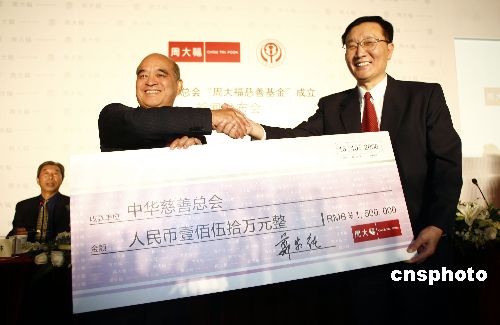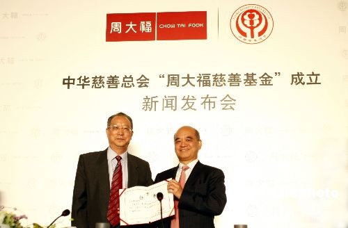 10月中旬,周大福集團(tuán)與中華慈善總會在京召開新聞發(fā)布會,宣布 “周大福慈善基金” 正式成立。發(fā)布會上,全國政協(xié)常委、中華慈善總會榮譽(yù)會長、周大福集團(tuán)董事總經(jīng)理鄭家純博士代表周大福集團(tuán),向中華慈善總會轉(zhuǎn)交了“基金”首筆慈善捐款150萬元,用以啟動開展“基金”第一階段助學(xué)助孤慈善項(xiàng)目。全國人大代表、中華慈善總會副會長李本公,中華慈善總會副會長張道誠,中華慈善總會秘書長劉國林,副秘書長韓京津出席了儀式,并向鄭家純博士頒發(fā)了捐贈證書和榮譽(yù)會長證書。中新社發(fā) 楊可佳 攝