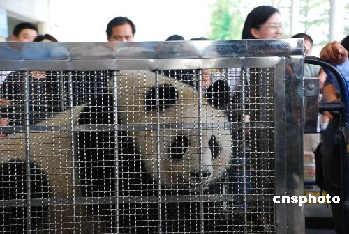 10月22日,兩只國寶級大熊貓“樂山”、“珍大”抵達杭州蕭山國際機場,立即乘車去它們的新家——浙江安吉竹博園落戶。據飼養員史斌遞介紹,這兩只大熊貓來自四川成都大熊貓繁育研究基地,均為雄性,每只重約100公斤,年齡都大約在兩歲半左右,相當于人類的八九歲。它們都很好動,愛爬樹,是熊貓家族里的“運動健將”。中新社發 夏毅 攝