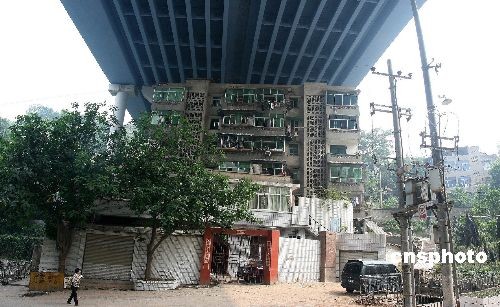 圖為重慶渝黔高速路南山立交橋下的一幢6層居民樓,此樓樓頂立交橋,背倚橋柱,在網上被稱為“終年曬不到太陽、淋不到雨的最牛的樓房”。而近日這棟“最牛樓房”還未拆遷,旁邊卻又要開建新房,引起了廣大市民的熱議。中新社發 孫須 攝