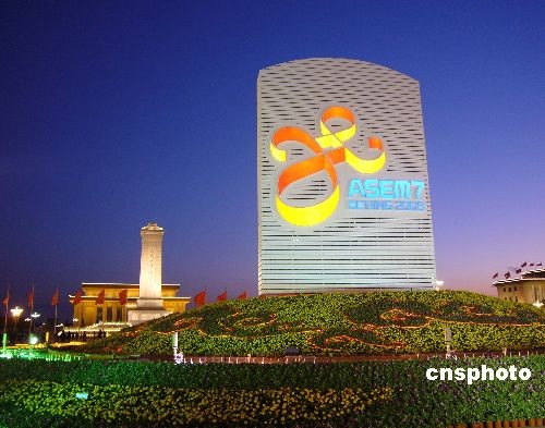 2008年10月23日傍晚,北京天安門廣場燈火通明,夜色璀璨。第七屆亞歐首腦會議標識在五色燈光照射下,更加醒目美麗。中新社發 玉龍 攝