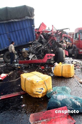 11月14日6時(shí)30分,由于受團(tuán)霧影響,滬昆高速江西東鄉(xiāng)縣195KM--196KM處往南昌方向同時(shí)間發(fā)生5起汽車追尾事故,造成16輛貨車追尾,高速公路交通一度受阻。據(jù)了解,事故已造成5人死亡、10人受傷。經(jīng)過當(dāng)?shù)赜嘘P(guān)部門全力搶救,到上午10時(shí),滬昆高速公路事故路段實(shí)行交通疏導(dǎo)分流,恢復(fù)部分交通,目前事故還在進(jìn)一步清理調(diào)查中。中新社發(fā) 何江華 攝