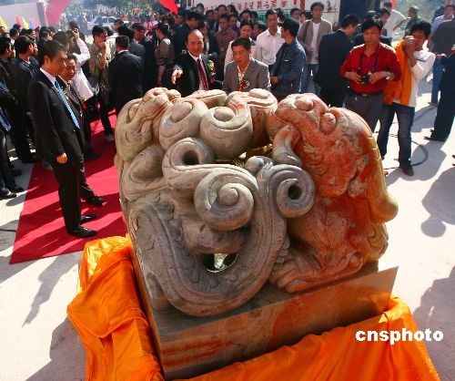 11月15日上午,毛澤東龍鈕大印啟運儀式在福建福州晉安區(qū)新店民營工業(yè)區(qū)藏天園一樓舉行。壽山石作為世界上獨有的珍貴彩石,兼具“細、結(jié)、潤、膩、溫、凝”六德,以質(zhì)地最好、品種最多、色彩最豐富、開發(fā)利用歷史最悠久、雕刻工藝最高、影響最廣泛而聞名于世,歷代帝王均以壽山石為印璽。毛澤東龍鈕大印作為新落成的毛澤東紀(jì)念館鎮(zhèn)館之寶。該印重達5噸,寬度為1150毫米,寓意毛澤東今年誕辰為115周年,印章高為1226毫米寓意毛澤東出生時間12月26日,整個印章為一塊完整壽山原石雕刻而成。該原石由一個30多噸重的壽山石胚,由幾十名藏天園工藝師經(jīng)過一個多月日夜雕刻而成。中新社發(fā) 祝敏松 攝