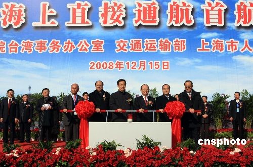 12月15日,海峽兩岸海上直接通航首航儀式在上海洋山港舉行,中遠公司的“遠河”號和中海公司的“新非洲”號從洋山港啟航執行首航任務。當日,海峽兩岸海上、空中直航及直接通郵在兩岸同步啟動。中新社發 湯彥俊 攝