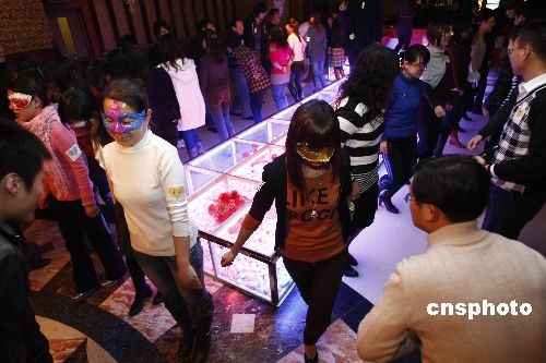 12月27日,百余名單身青年在北京參加一場化妝舞會。年輕人在歡快的樂曲中翩翩起舞。面具下的女青年拋開羞澀,與男舞伴竊竊私語。該活動的初衷也是為了引導(dǎo)年輕人在擇偶時拋開外在條件,認識到“相容成就幸福婚姻”才是健康婚戀理念。中新社發(fā) 楊影懿 攝