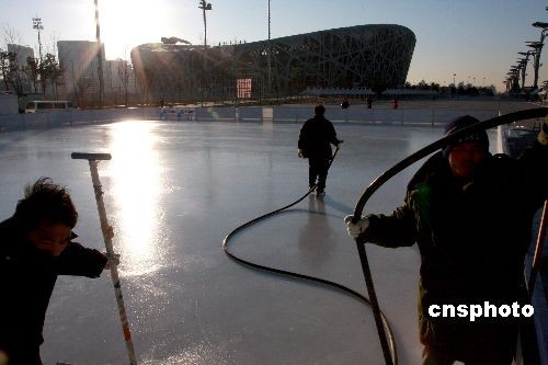 12月31日,北京國家體育場“鳥巢”旁玲瓏塔下,一塊近1000平方米的空地被厚厚的冰層覆蓋。據現場施工人員介紹,該場地正在建造溜冰場,預計冰面能達到5-6厘米厚,面積約1000平方米,為迎接元旦、春節“雙節”來臨而準備的臨時冰場,預計元旦即可正式對游客開放。