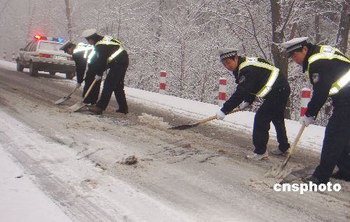 2009年1月4日,安徽省巢湖市含山縣交警大隊(duì)太湖山中隊(duì)的干警正在太湖山險(xiǎn)要路段鏟雪。元月3日夜間,該縣迎來今冬第一場(chǎng)雪,部分路段已積上厚厚的冰層。為了給即將來臨的春運(yùn)工作打下堅(jiān)實(shí)的基礎(chǔ),維護(hù)良好的道路交通秩序,給廣大群眾營(yíng)造良好的交通環(huán)境,當(dāng)天一大早,含山縣交警大隊(duì)太湖山中隊(duì)組織民警上路巡邏,重點(diǎn)加強(qiáng)對(duì)山路的安全隱患排查清理。中隊(duì)民警鏟除幾個(gè)連速彎道上的厚層冰雪,并用掃帚將鏟除堆積的冰雪清掃出路邊,保證了過往車輛的安全通行。中新社發(fā) 豐成 攝