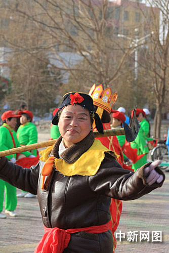 2月13日,嘉峪關市前進路街道社區,一位身著“豬八戒”服飾的婦女在秧歌隊中尤其顯眼。近年來,嘉峪關投資為每個社區都建立了文化活動室和休閑娛樂區。
