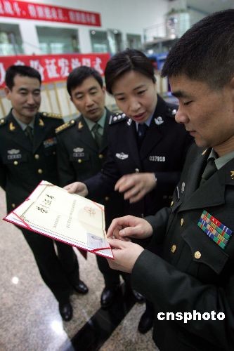 二月二十三日,北京海淀警方人口處警員來(lái)到中國(guó)航天員科研訓(xùn)練中心,為航天英雄、中國(guó)航天員科研訓(xùn)練中心副主任楊利偉、神七航天英雄翟志剛、英雄航天員劉伯明、景海鵬及其他航天員代表頒發(fā)居民身份證。中新社發(fā) 韓峻巍 攝