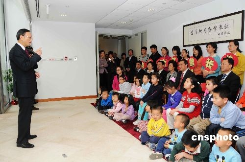 當地時間三月十二日,正在美國訪問的中國外交部部長楊潔篪來到中國駐美大使館視察中國250多家駐外使領館中的一所學校——駐美使館陽光學校。楊潔篪在和學校孩子們交談時鼓勵他們學說中國話,學寫中國字,學做中國人,并為陽光學校題寫校訓:“愛國勵志勤學奉獻”。圖為楊潔篪在和陽光學校老師和孩子們交流中。 中新社發 邱江波 攝