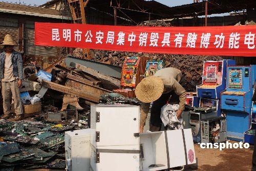 三月十三日,昆明市公安局集中銷毀賭博性游戲機及電路板共1560件,價值上百萬元人民幣。這種賭博游戲機通過無線收發器來控制內部的電腦,達到操縱賭博結果的目的。圖為被銷毀的賭博游戲機。中新社發 劉冉陽 攝