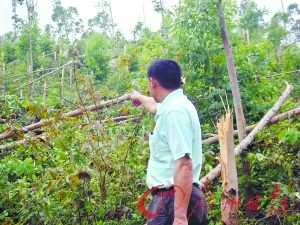 “半夜聽(tīng)到呼呼的風(fēng)聲,隱約看到有白影在移動(dòng),接著冰雹就砸下來(lái)了。”當(dāng)夜正在值守的中興村村委會(huì)書(shū)記馮文安回憶道。昨日凌晨2時(shí)50分至3時(shí)10分,一股強(qiáng)勁的龍卷風(fēng)在臨田村北部的山林出現(xiàn),從臨田村村邊的水田和果林掠過(guò)。