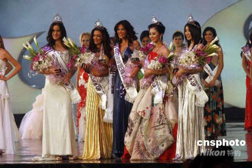 4月10日晚,2008國際旅游小姐冠軍總決賽暨頒獎晚會在河南鄭州隆重舉行。秘魯小姐Silvia Vanessa (中)獲得本年度國際旅游小姐冠軍。代表中國參賽、浙江傳媒大學一年級的大學生童鶴(右二)和加拿大小姐Sahar Biniaz (左二)分獲亞軍和季軍。中新社發 慎重 攝