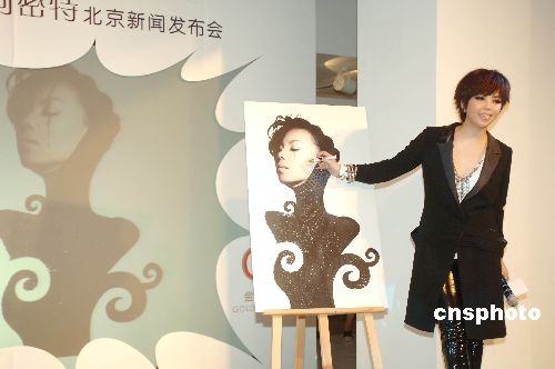 7月9日,闊別3年的張惠妹現身北京,攜新專輯《阿密特》與媒體見面。阿妹的新專輯策劃非常有創意,阿密特(A-MIT)是張惠妹的卑南族名字。阿妹還以專輯中第一首開場曲《分生》現場說法:“從‘張惠妹’這個音樂品牌里面分生,生出了另一個音樂品牌,《分生》就是這個意思,從張惠妹中分生出了完全獨立的一個阿密特,一個只為歌唱而活,只為音樂而生的歌手。”整張專輯音樂充滿實驗性,金曲制作人“阿弟仔”與阿妹共同操刀制作,整張專輯彌漫著BANDSOUND氛圍。創作陣容包括蘇打綠的青峰、創作人小安、名作詞人林夕、姚若龍、陳鎮川。更特別的是,專輯還收錄了張媽媽的作品,以及臺語歌曲和原住民的傳統古調。圖為張惠妹為新專輯造型畫上金色裂痕,象征阿密特破繭而出。中新社發 李學仕 攝