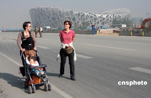 2007年10月21日,兩位外國女游客帶著孩子觀看“鳥巢”國家體育場。劉敬民代表19日在新聞發(fā)布會上說,除國家體育場因開幕式工程需要,在明年3月份竣工外,其他場館都將按計劃在年底完工。中新社發(fā) 吳芒子 攝