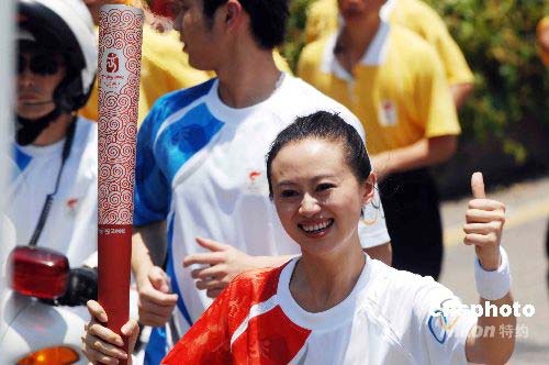 5月8日中午,奧運火炬接力傳遞在深圳舉行,前奧運會體操冠軍肖俊峰、2011年世界大學生運動會形象大使戴菲菲(圖中)、11次打破女子撐桿跳高世界紀錄的孫彩云等社會各界208名火炬手穿越深圳。中新社發 陳文 攝