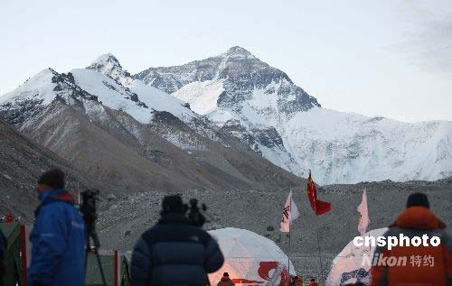 5月8日,北京奧運圣火成功登頂珠穆朗瑪峰。受邀采訪2008北京奧運火炬接力珠峰傳遞的中外媒體一早就趕到珠峰大本營,希望拍攝到中國登山隊員在珠峰的影子。在場的美聯社、路透社、法新社等眾多國際媒體第一時間報道了圣火登頂的消息。中新社發 盛佳鵬 攝