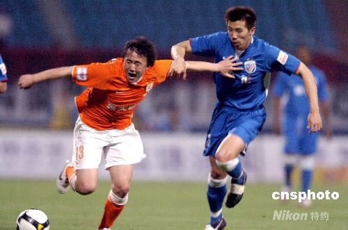 5月10日,2008中國足球超級聯賽7輪在山東濟南的一場比賽中,主場作戰的山東魯能泰山隊以2比1戰勝上海申花隊。中新社發 張侃 攝