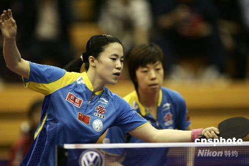 5月15日,在長(zhǎng)春舉行的2008年國際乒聯(lián)巡回賽中國乒乓球公開賽進(jìn)入第二天的比賽,在女子團(tuán)體比賽中,王楠、張怡寧組合3比1戰(zhàn)勝日本福原愛、福岡春菜組合。中新社發(fā) 杜洋 攝