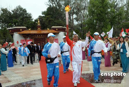 北京奧運會火炬二十一日九時十分許在西藏自治區首府拉薩開始傳遞,第一次從北坡登上珠峰的藏族登山老英雄貢布擔任第一棒。此次拉薩傳遞共一百五十六名火炬手,其中包括七十八名以藏族為主題的少數民族和一名外籍人士。傳遞起點設在有“寶貝園林”之稱的羅布林卡廣場。 中新社發 廖攀 攝