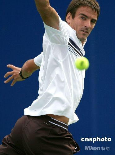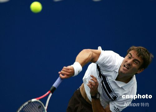 9月23日,2008年中國網(wǎng)球公開賽舉行男單首輪比賽,西班牙名將羅布雷多以6:4、7:5戰(zhàn)勝同胞洛佩茲,成功殺進男單第二輪比賽。 中新社發(fā) 富田 攝