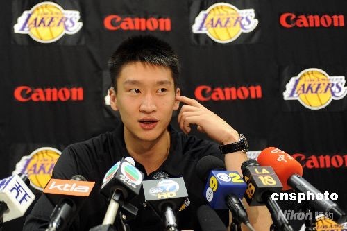 9月24日下午,美國NBA洛杉機湖人隊在自己的訓練基地舉行記者會,正式向媒體記者介紹剛剛加盟的中國球員孫悅。孫悅在記者會上用流利的英語回答記者提問。孫悅說,他對自己在湖人隊的位置很清醒,自己會加倍努力,盡量多爭取上場時間。圖為孫悅向記者解釋外號“Q”的來歷。中新社發 張煒 攝