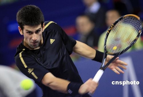 11月9日,2008年上海網球大師杯在上海旗忠網球中心拉開戰幕。在當日進行的金組首場比賽中,塞爾維亞小天王德約科維奇以2比0戰勝阿根廷選手德爾波特羅,迎來自己在上海網球大師杯上的首場勝利。去年,德約科維奇首次亮相上海網球大師杯,小組賽3戰盡墨。中新社發 湯彥俊 攝